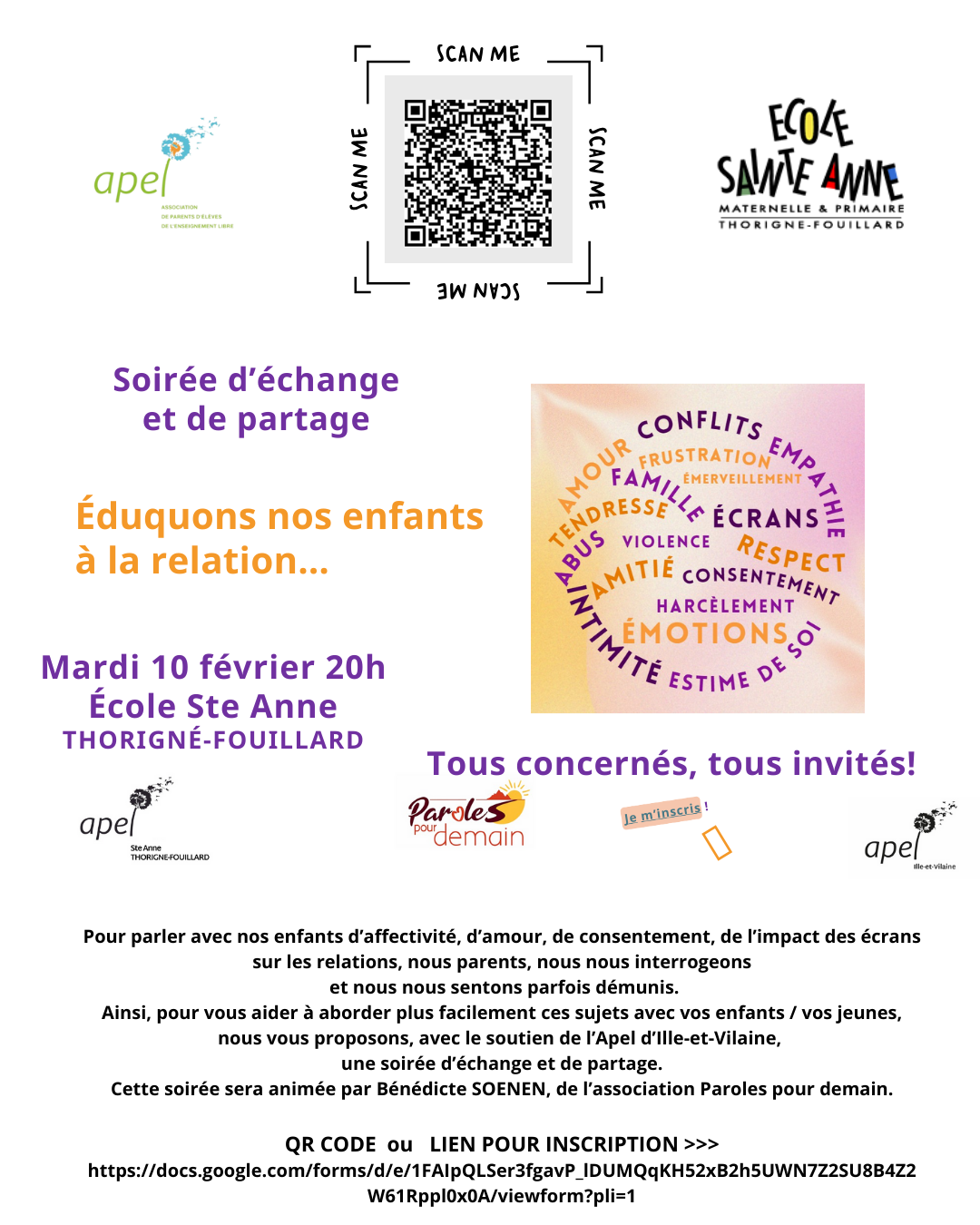Comment s’inscrire ? C’est simple : scannez le QR code sur l’affiche ou envoyez un mail à : apel-sainte-anne-thorigne@mailo.com