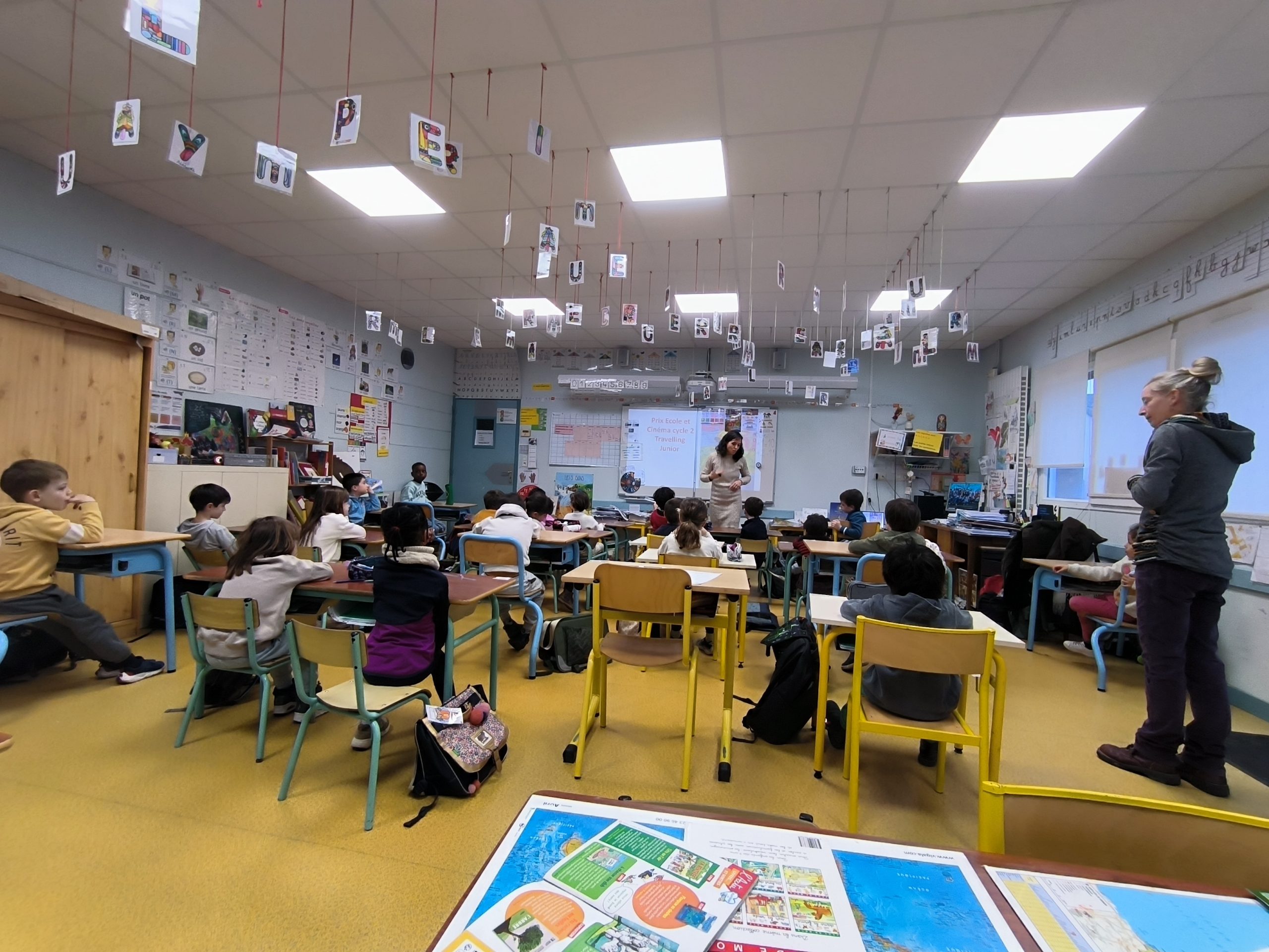 Ce matin, Nolwenn Judais, chargée de mission EAC (Éducation Artistique et Culturelle) à la DDEC, est intervenue dans la classe de CP de Nathalie, engagée — tout comme la classe de CE1 d’Alexandre — dans le dispositif École et Cinéma.