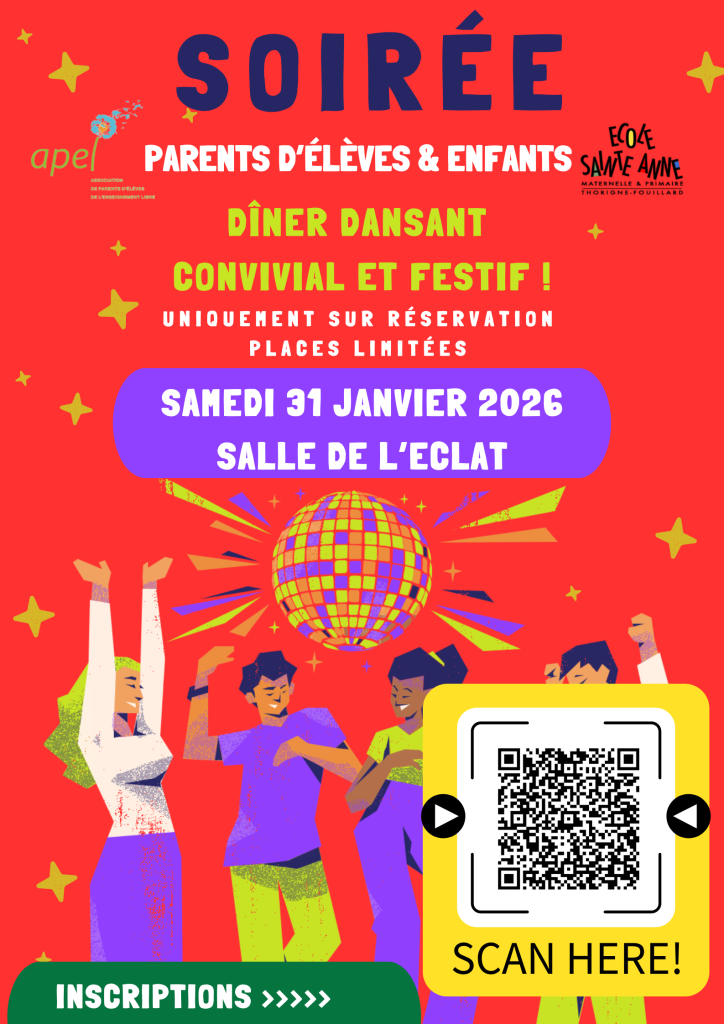 RESERVATION OBLIGATOIRE (soirée privée et réservée aux familles de l’école) >>> https://www.helloasso.com/associations/apel-sainte-anne-thorigne-fouillard/boutiques/repas-et-soiree-dansante